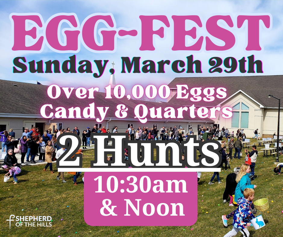 Invite your neighbors and friends to celebrate Palm Sunday with egg hunts at EGG-FEST! Egg hunts will follow services (about 10:30 and Noon). We will hide over 10,000 EGGS in the backyard of Shepherd. Eggs will be stuffed with candy and quarters. We cannot wait to see you for EGG-FEST!